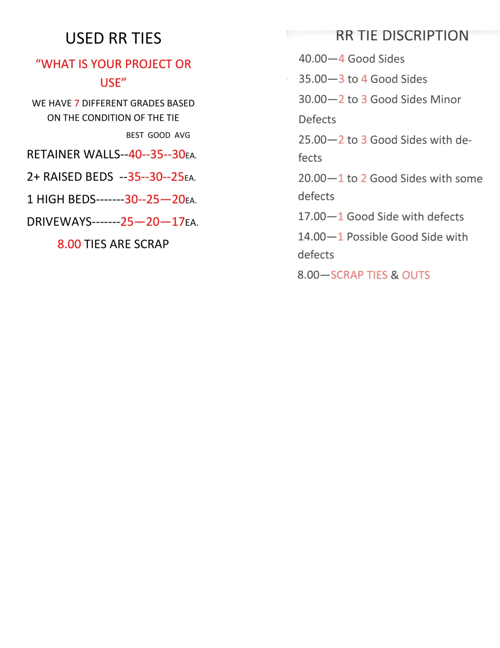 We have the best bang for your buck when it comes to RR ties & Landscape timbers. OUR LIGHTED DISPLAY LOT IS OPEN 24/7 With all products priced so come browse at your convenience